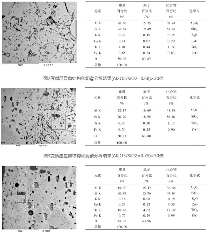 從熱力學(xué)上看,Al₂O₃-SiO₂系材料[4]各物相在氯化反應(yīng)中:莫來(lái)石相(A₃S₂)非常不穩(wěn)定,其成份見(jiàn)表2,石英相(SiO₂)非常穩(wěn)定,剛玉相(Al₂O₃)居中;在碳熱還原中:石英相非常不穩(wěn)定,剛玉相非常穩(wěn)定,莫來(lái)石相居中。在實(shí)際中,爐襯材料是如何損壞的,其過(guò)程是怎樣發(fā)生的,這要從殘磚顯微結(jié)構(gòu)分析入手。