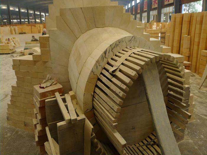 弧形段外環(huán)耐火隔熱磚(含耐火纖維)應(yīng)與內(nèi)環(huán)耐火磚同時(shí)砌筑,不宜相隔太遠(yuǎn)。