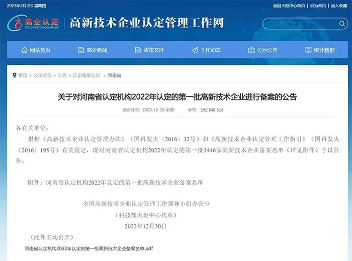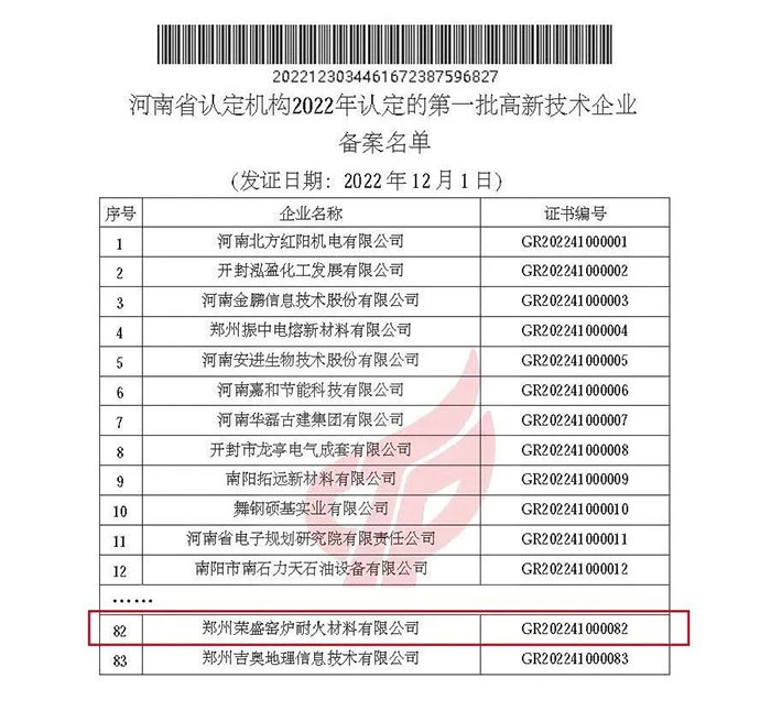 近日,高新技術(shù)企業(yè)認(rèn)定管理工作領(lǐng)導(dǎo)小組辦公室發(fā)布了《關(guān)于對河南省認(rèn)定機(jī)構(gòu)2022年認(rèn)定的一批高新技術(shù)企業(yè)進(jìn)行備案的公告》。由多個部門審核推薦,經(jīng)專家評審,鄭州榮盛窯爐耐火材料有限公司通過2022年度“國家高新技術(shù)企業(yè)”復(fù)審。此次是2019年公司初次獲得國家高新技術(shù)企業(yè)以來,再次被復(fù)審認(rèn)定為國家高新技術(shù)企業(yè)。