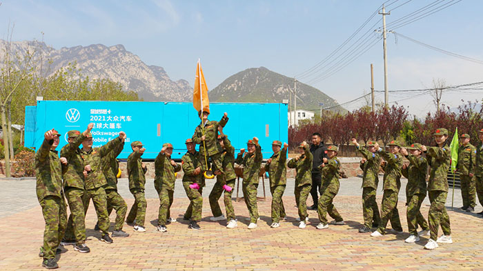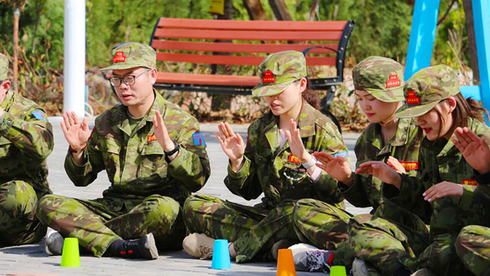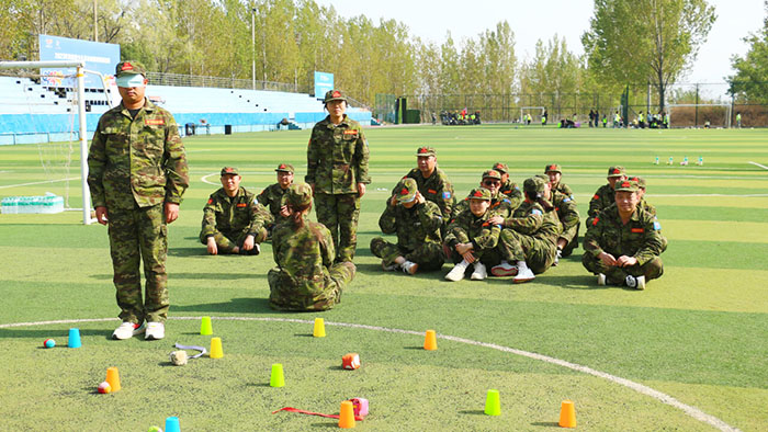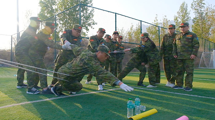 在【沙場(chǎng)點(diǎn)兵】項(xiàng)目,要求每個(gè)隊(duì)選出一個(gè)總指揮做將軍,一個(gè)協(xié)調(diào)者做軍師,剩余伙伴作為士兵。設(shè)定將軍起著總指揮的作用,但無(wú)法看見(jiàn)戰(zhàn)場(chǎng)的具體情況,其命令需由軍師來(lái)傳達(dá)。而軍師則只能用肢體語(yǔ)言告訴將軍該如何部署,士兵們則需要蒙著眼睛聽(tīng)將軍命令,從而實(shí)現(xiàn)在沙場(chǎng)前進(jìn)、攻擊。當(dāng)規(guī)則定好,每個(gè)人所要做的就是各司其職。有人規(guī)劃部署,有人上傳下達(dá),有人依命令行事,雖然有理解錯(cuò)誤、聽(tīng)錯(cuò)命令的情況發(fā)生,大家還是玩得不亦樂(lè)乎。在這個(gè)項(xiàng)目中,大家感悟到正確溝通的重要性。