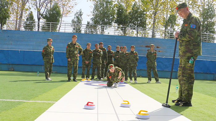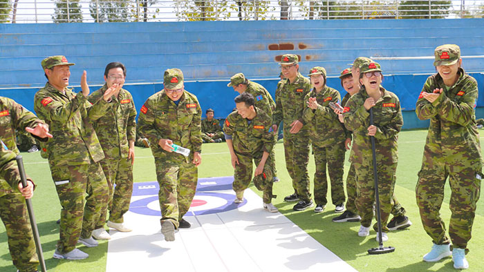 在【旱地冰壺】項(xiàng)目中,八個(gè)小組的隊(duì)員們一邊商榷對(duì)敵戰(zhàn)術(shù),一邊進(jìn)行任務(wù)分配。隨著一聲哨響,兩個(gè)賽隊(duì)同時(shí)開(kāi)賽。隊(duì)員們?nèi)褙炞、凝神靜氣,向前邁步?jīng)_刺,揮動(dòng)手臂擲壺,冰壺按照隊(duì)員們?cè)O(shè)想的路線擊打到對(duì)方的冰壺,使其滑出得分圈并穩(wěn)穩(wěn)地停留在中心點(diǎn),成功得分,大家歡呼雀躍,圍觀隊(duì)員們也紛紛叫好,掌聲、歡呼聲此起彼伏,好不熱鬧。